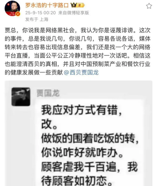 还是先说一下罗师傅。玉龙应该也不是单纯开喷,最近正赶上《预制菜食品安全国家标准》草案酝酿,这一波操作不光大顺风,说不定后面还能被锤粉们说成是鸡叫出太阳了。他直播间里也卖料理包,自己也说了不是反对预制菜,而是呼吁透明机制和行业标准。这点在立场上肯定是站得住的。但到底什么是标准,也许当年把日本工业食品夸上天的罗师傅到时候又会有不同见解。起码在户晨风之流跳出来赞美西贝的当下,罗师傅这次确实是站上高地了。