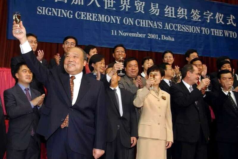 2001年,中国对外贸易经济合作部部长石广生(前排左一)庆祝中国加入世界贸易组织。 Wang Jianhua/Xinhua, via Getty Images