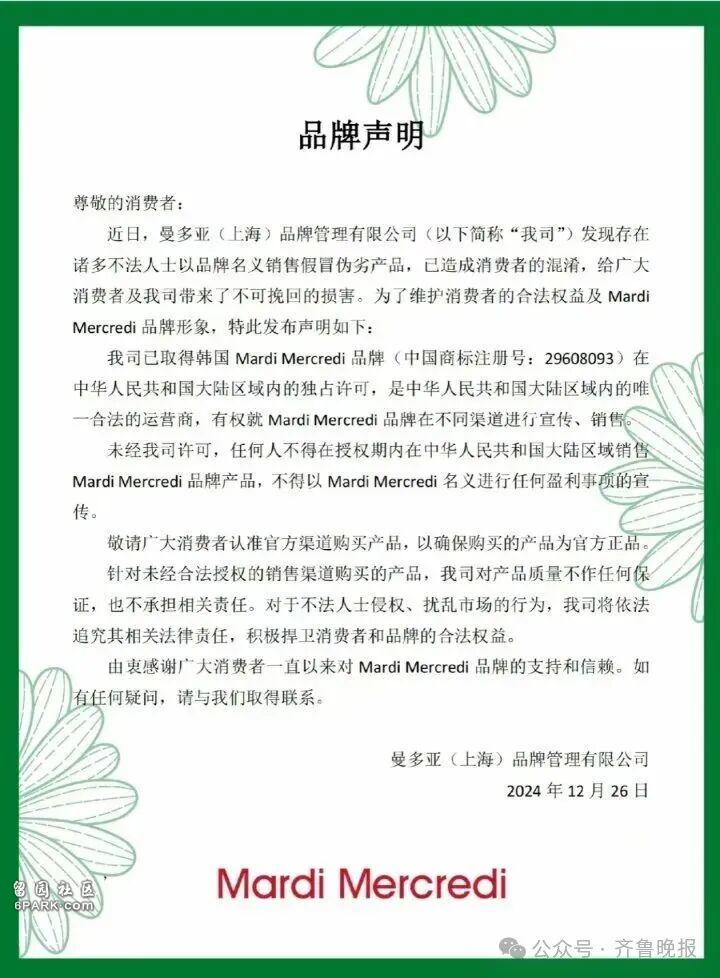 不过,中国市场一直存在大量Mardi Mercredi假冒品,近年来还有仿冒品牌在线下开出多家门店。曼多亚曾在2024年底发布声明,称其为Mardi Mercredi在中国大陆地区的唯一合法运营商。
