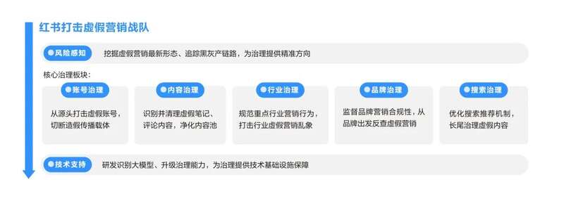 为此,战队涵盖账号、内容、行业、品牌、搜索五大治理板块,在技术团队的支持下,得以对虚假营销进行系统化、全链路治理。
