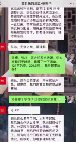 近期,社交媒体流传的一份微信对话截图显示,备注名称为“西贝采购总监张明华”的人士对供应商“胡总”要求退回所有预制产品,并称公司已经面临大问题,出现闭店情况。