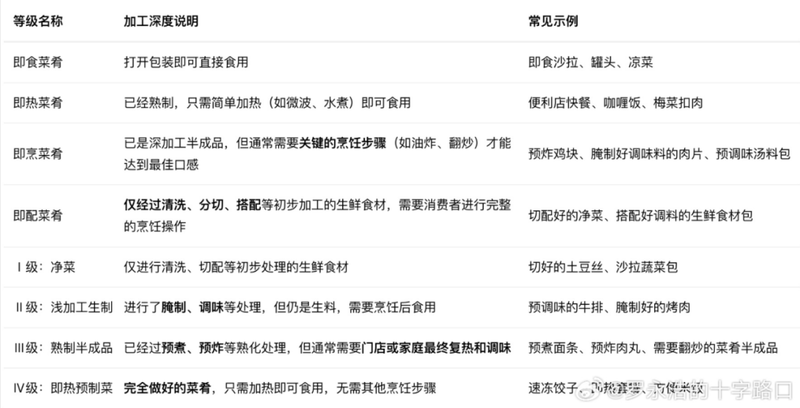 根据罗永浩发布的图片,I级为净菜,是仅经过清洗、分切、搭配等初步加工的生鲜食材,例如切好的土豆丝、沙拉蔬菜包。Ⅱ级为浅加工生制,进行了腌制、调味等处理,但仍是生料,需要烹饪后食用,例如预调味的牛排、腌制好的烤肉。