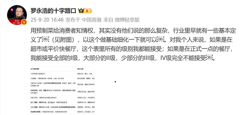 9月20日下午,罗永浩发布微博称,“用预制菜给消费者知情权,其实没有他们说的那么复杂,行业里早就有一些基本定义了,以这个做基础细化一下就可以。”