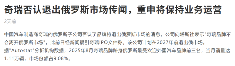 一家名为《莫斯科时报》的海外媒体爆料,说奇瑞汽车将于2027年,退出俄罗斯市场。奇瑞官方第一时间辟谣了。别看这家媒体名叫《莫斯科时报》,但它早就被俄罗斯官方拉黑了。