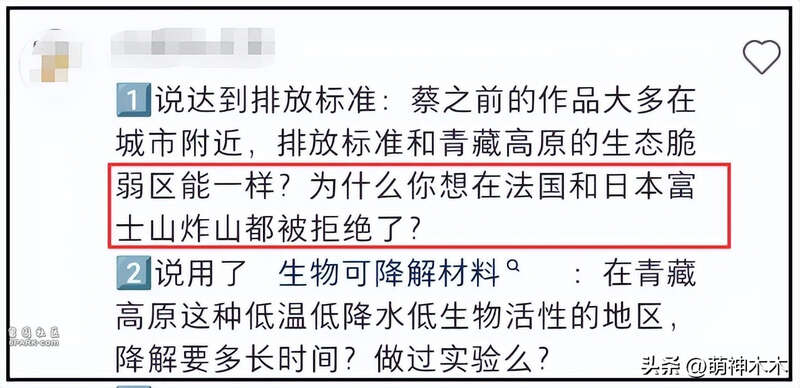 一个被法国和日本拒绝的项目,如今在生态环境更加脆弱的青藏高原上被实现了,让很多人觉得悲哀。结合蔡国强和始祖鸟强调的“手续合法合规”,不少网友开始质疑有关部门的工作人员,是否尽职尽责。