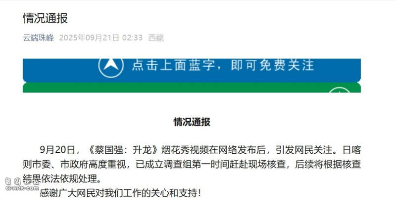 9月21日,官方平台“云端珠峰”发布情况通报:9月20日,《蔡国强:升龙》烟花秀视频在网络发布后,引发网民关注。日喀则市委、市政府高度重视,已成立调查组第一时间赶赴现场核查,后续将根据核查结果依法依规处理。