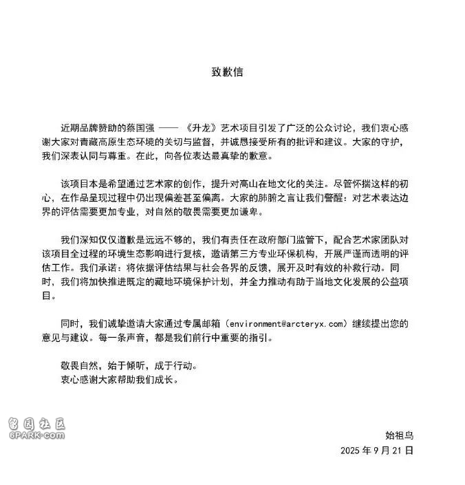 9月21日,始祖鸟在国内社媒平台致歉,称对艺术表达边界评估要更专业、对自然要更谦卑,承诺在政府监管下,配合团队复核项目生态影响,邀第三方评估并依结果补救,同时推进藏地环保计划与文化公益项目。蔡国强工作室同日说明,虚心接受批评,将配合评估,如有影响会尽力补救。