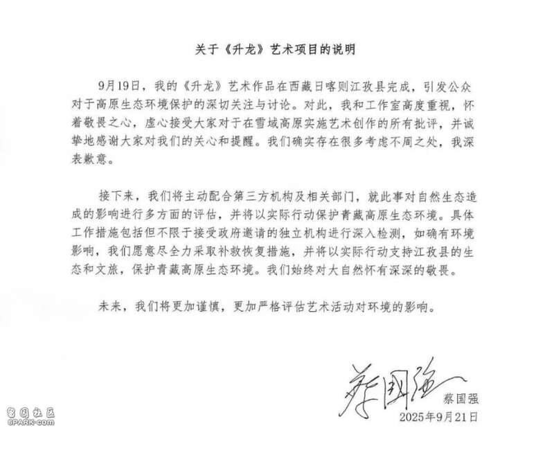 9月21日,蔡国强发布关于《升龙》艺术项目的说明:9月19日,我的《升龙》艺术作品在西藏日喀则江孜县完成,引发公众对于高原生态环境保护的深切关注与讨论。对此,我和工作室高度重视,怀着敬畏之心,虚心接受大家对于在雪域高原实施艺术创作的所有批评,并诚挚地感谢大家对我们的关心和提醒。我们确实存在很多考虑不周之处,我深表歉意。