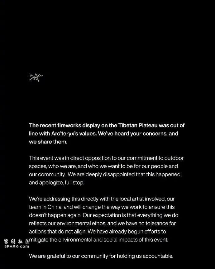 现代快报记者注意到,始祖鸟海外社媒也发了英文致歉信,不过内容与国内版本有差异。海外版称对青藏高原烟花表演深感遗憾,此行为与品牌环保价值观及期望不符,郑重致歉。同时,还提到“正与相关艺术家和中国团队沟通,调整工作方式避免类似情况”。