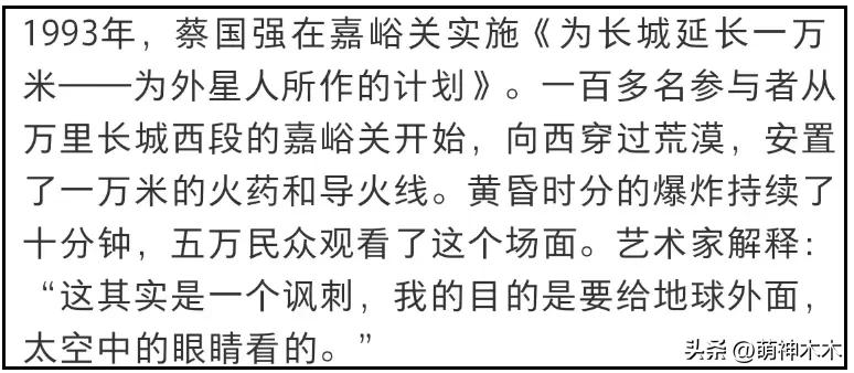 不仅如此,蔡国强曾经在1993年,打着“延长长城一万米”的旗号,把一万米导火线和600公斤火药带到长城末端点燃,自称“划破了大漠,将长城延长了15分钟。”九十年代网络不发达,不知道最后燃放的垃圾,蔡国强和团队有没有及时处理。