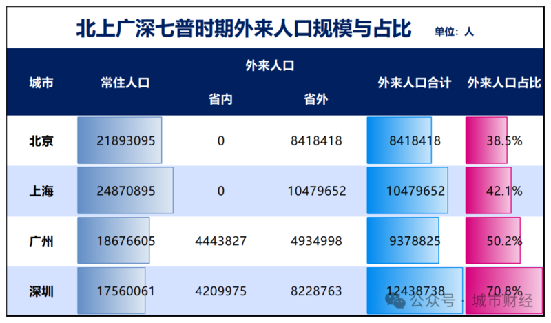 本号不久前写过一篇虹吸全国!北京、上海、广州、深圳,哪里的外地人最多?(点击标题即可查看),文章根据四大一线城市统计局公布的七普数据,梳理了一下一线城市虹吸的人口情况。