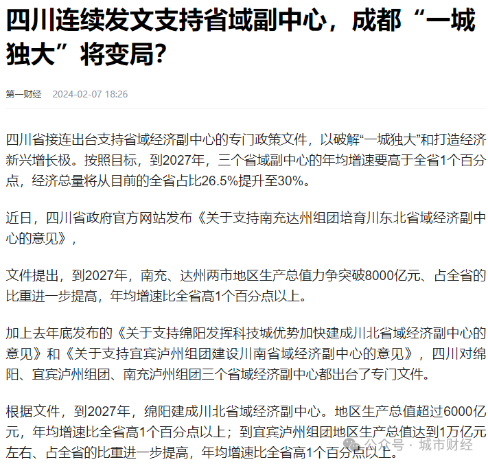 安徽在发布的《安徽省国土空间规划(2021-2035年)》里提出,芜湖为省域副中心。将强省会战略做到极致的四川,在2023年年底至2024年,先后发布了《关于支持绵阳发挥科技城优势加快建成川北省域经济副中心的意见》、《关于支持宜宾泸州组团建设川南省域经济副中心的意见》、《关于支持南充达州组团培育川东北省域经济副中心的意见》,明确提到了打造三个组团省域副中心:南充-达州、绵阳、宜宾-泸州。