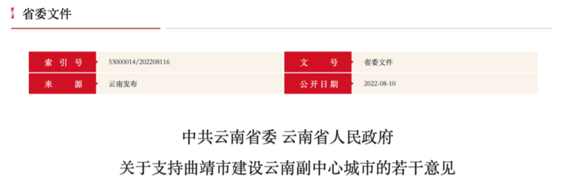 同一年,云南省印发《关于支持曲靖市建设云南副中心城市的若干意见》,其中明确提出:到2025年,云南副中心城市基本建成,经济总量占全省的比重超过15%。全省先进制造业中心基本建成,网络型基础设施体系基本形成,城市综合承载能力和服务功能大幅提升,辐射力影响力带动力明显增强。