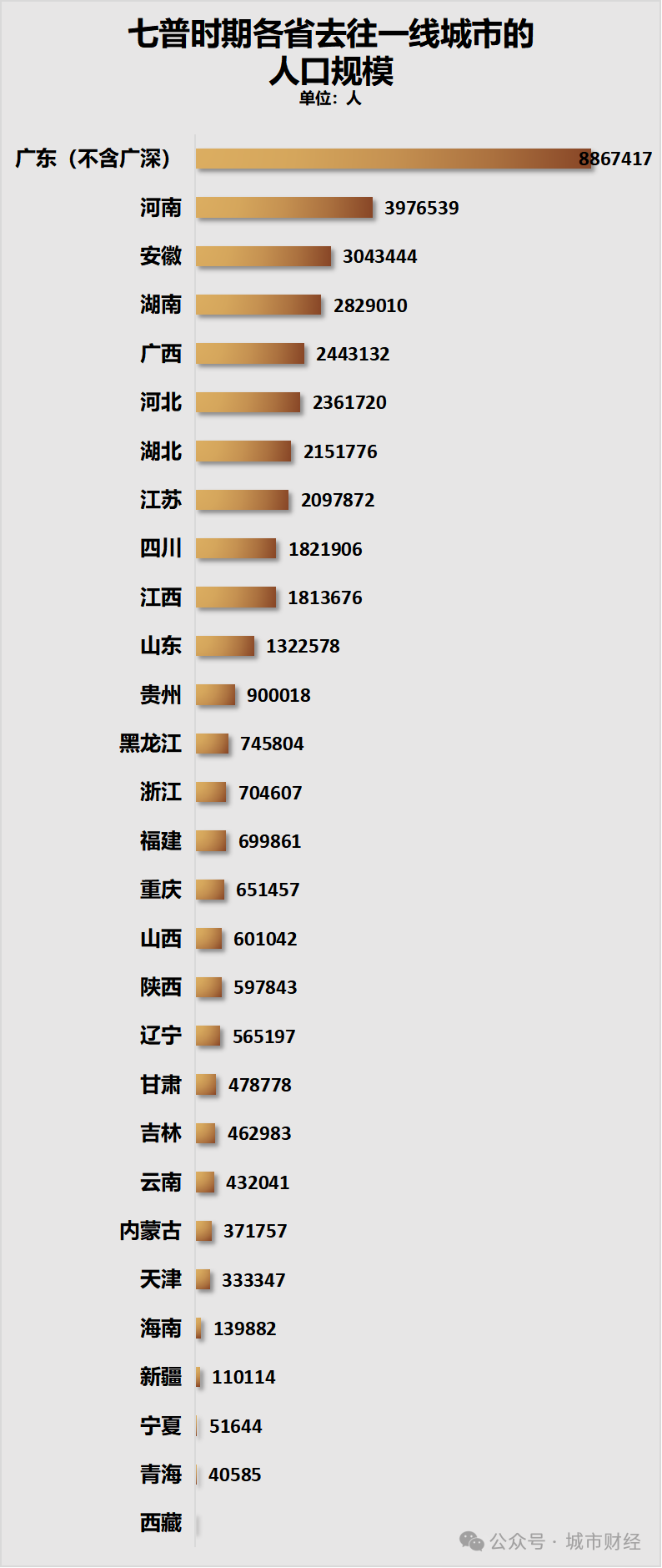 其中广东省去往一线城市的人口最多,广东省在扣除广州户籍人口、深圳户籍人口之后,广东其他19个市总共有886.74万人去了一线城市。当然广东省去的一线城市是自家的广州和深圳,广东省去往北京、上海的人口只有21万,所以绝大多数并不算外流。抛开广东来看。2010年至2020年十年间,河南省仅去往四大一线城市的人口就有397.7万人,安徽有304.3万人,湖南有282.9万人,广西有244.3万人,河北有236万人。四川省去往一线城市的人口只有182.2万人。而四川省的常住人口规模位居全国第五,试想一下如果四川如果没有一个强大的成都,去往一线城市的规模大概率会比湖南多。湖南湖北若不走强省会路线,去往一线城市的人口会更多。