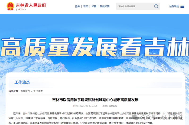 2024年吉林省吉林市市长王吉透露,吉林市正在打造省域副中心。2025年吉林省发布了《吉林市以信用体系建设赋能省域副中心城市高质量发展》,其中明确提到:吉林市将持续深化社会信用体系建设,让信用之光照亮江城每一个角落,为加快建设形神兼备的新时代省域副中心城市注入源源不断的“信用力量”。