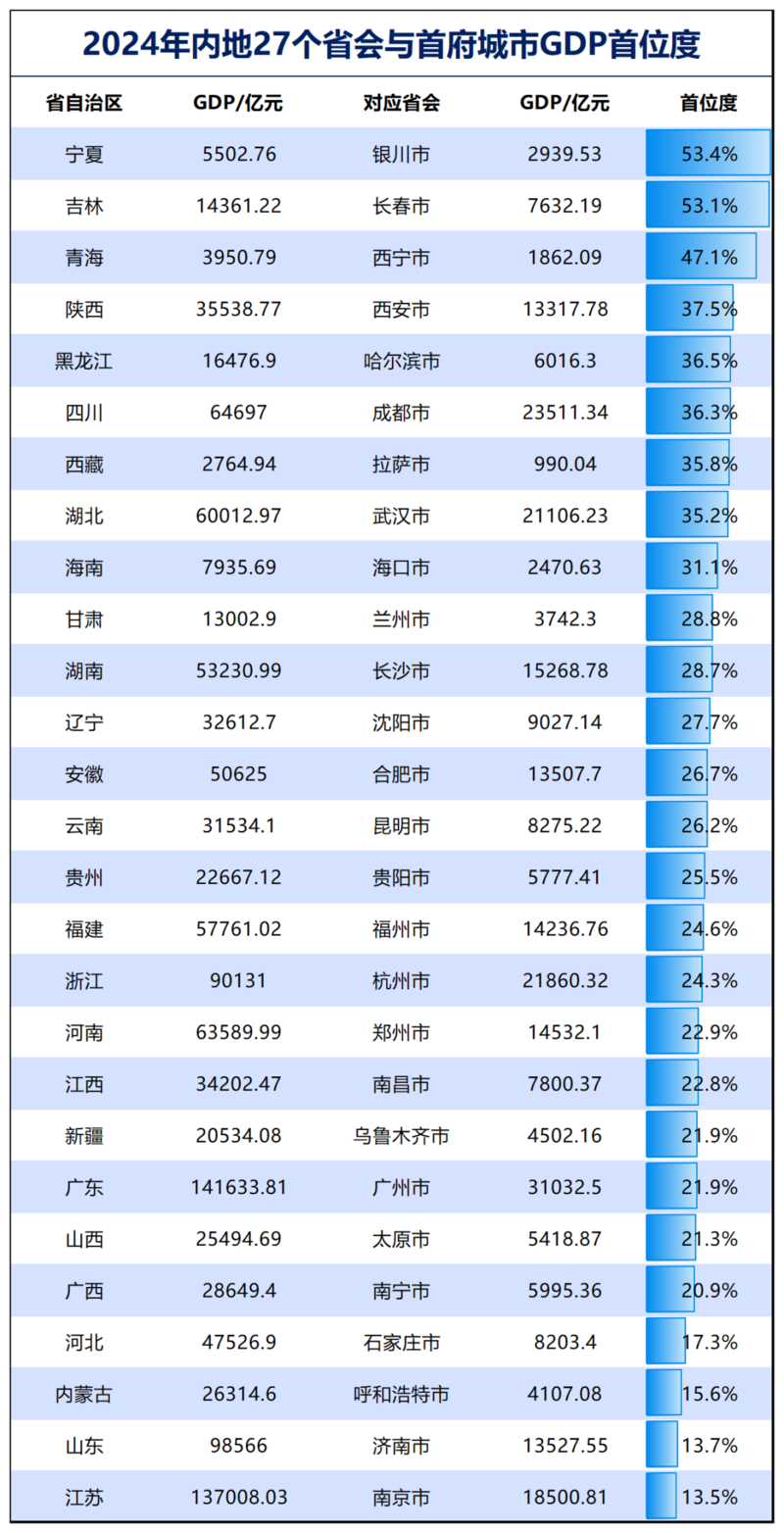 2024年年末数据显示:宁夏、吉林一半以上的经济都装在了首府银川、省城长春的口袋。西宁的经济首位度也接近50%。西安、哈尔滨、成都、拉萨、武汉的首位也超过了三分之一。海口接近三分之一。长沙、沈阳、合肥、昆明、贵阳的经济首位度超过四分之一。