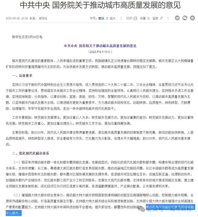8月28日,国务院发布的《关于推动城市高质量发展的意见》,明确提到了这么一句话:推动有条件的省份培育发展省域副中心城市。