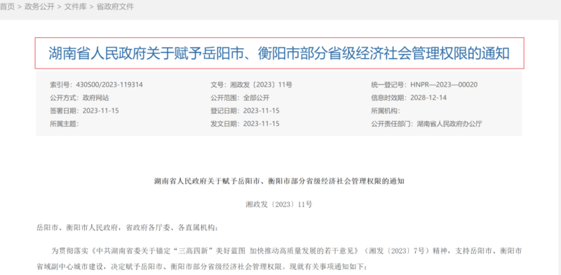 2023年,湖南省发布了《关于赋予岳阳市、衡阳市部分省级经济社会管理权限的通知》,开始加速放权。