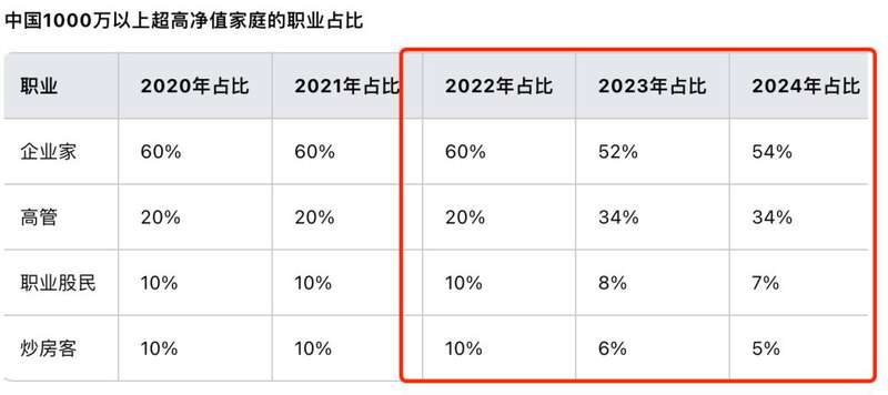 其中,1000万以上资产的富人家庭,职业变化最能反映楼市对富豪的影响。炒房客直接从2021—2024年4年平均的10%,降至5%,真的是想炒都炒不动。
