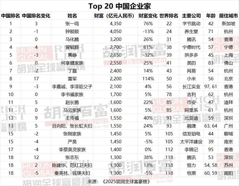 张一鸣取代了钟睒睒,成为中国首富;马化腾取代黄峥,以3200亿元人民币排名第三。