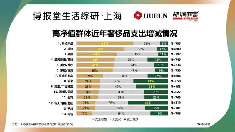例如在奢侈品消费方面,排在首位的居然是科技产品,占比62%;而腕表、私人飞机等传统奢侈品的消费占比分别减少了38%和44%;其中购买汽车的预算从78万元降至66万元。