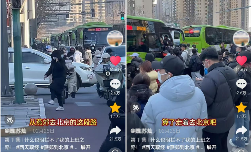 一位住在燕郊的抖音博主,曾记录了一次艰苦的上班经历:早晨7点,他登上前往北京的公交车,结果这辆车用了1小时,只走了1.7公里。他决定下车步行,走到堵车队伍的最前面,去坐“排头”那一辆。