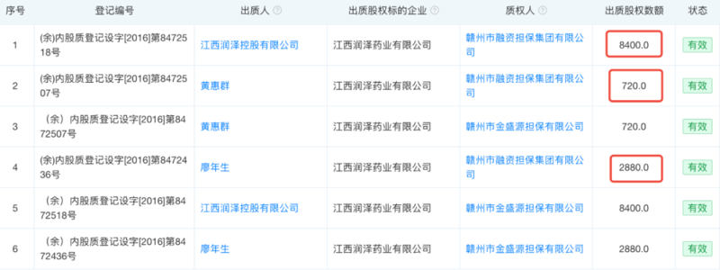 根据天眼查公布的信息,2016 年,江西润泽制药曾出质 12000 万元。