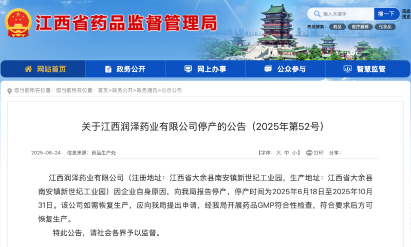 据江西省药监局官网公告,江西润泽药业因企业自身原因,向江西省药监局报告停产,停产时间为 2025 年 6 月 18 日至 2025 年 10 月 31 日。