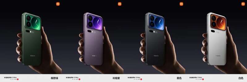 小米17Pro系列也有四款颜色,除黑白外,还有全新森野绿和冷烟紫。