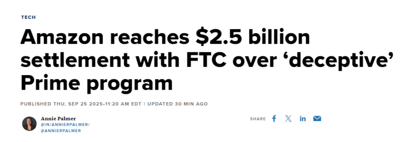 两年拉锯的官司终于落幕。电商巨头亚马逊不得不“掏钱认栽”,与美国联邦贸易委员会(FTC)达成史无前例的和解协议,支付 25亿美元,创下FTC执法史上最大罚金纪录。这起案件源自两年前拜登政府时期的起诉。本周一刚在西雅图开庭,周四就以和解收场。FTC指控亚马逊故意在Prime会员服务上设置“套路”: