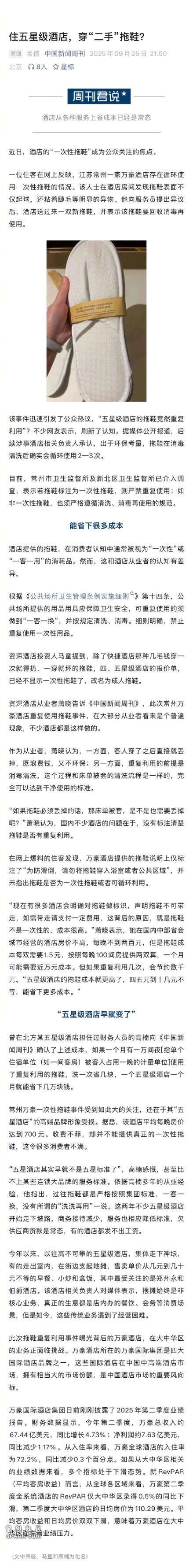 近日,酒店的“一次性拖鞋”成为公众关注的焦点。该事件迅速引发了公众热议,“五星级酒店的拖鞋竟然重复利用”?不少网友表示,刷新了认知。据媒体公开报道,后续涉事酒店相关负责人承认,出于环保考量,拖鞋在消毒清洗后确实会循环使用2—3次。资深酒店从业者萧晓告诉中国新闻周刊 ,此次常州万豪酒店重复使用拖鞋事件,在大部分从业者看来是个普遍现象,不少酒店都是这样做的。作为从业者,萧晓认为,一方面,客人穿了之后直接就丢掉,既浪费钱,又不环保;另一方面,重复利用的前提是消毒清洗,这个过程和床单被套的清洗流程是一样的,完全可以达到干净使用的标准。