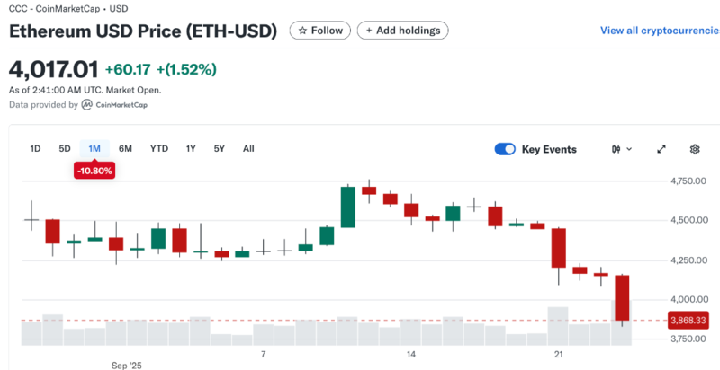全球第二大加密货币以太坊领跌了这场暴跌,创下自6月以来最陡峭的单周跌幅。本周,以太坊下跌约12%,跌破4000美元的关键支撑位。
