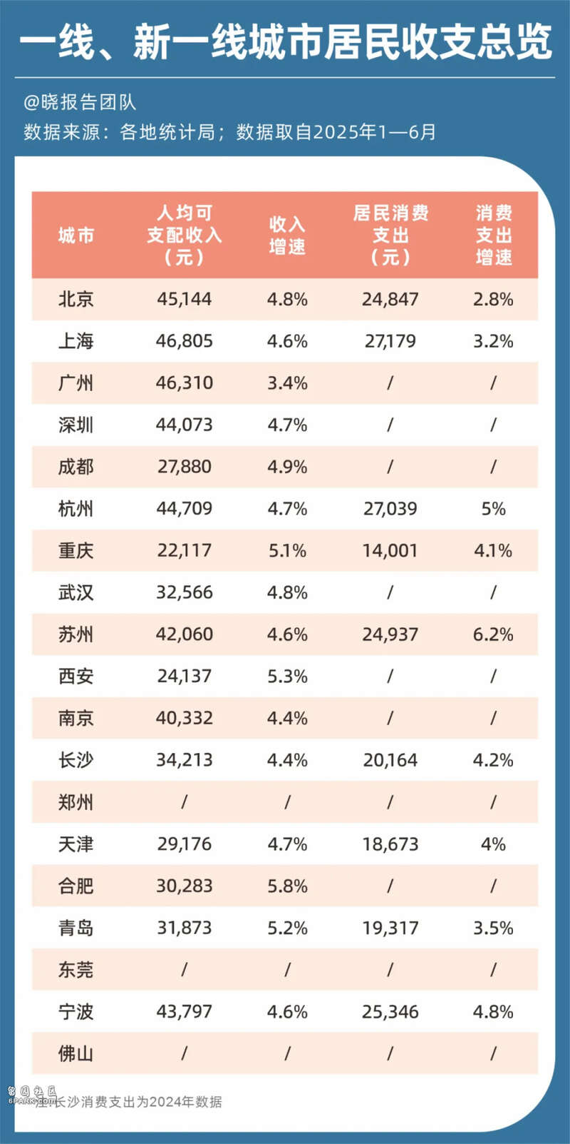 一线和新一线城市阵营中,上海半年人均可支配收入超4.6万元,稳坐头把交椅,但人均消费支出超2.7万元,也是全国最高。