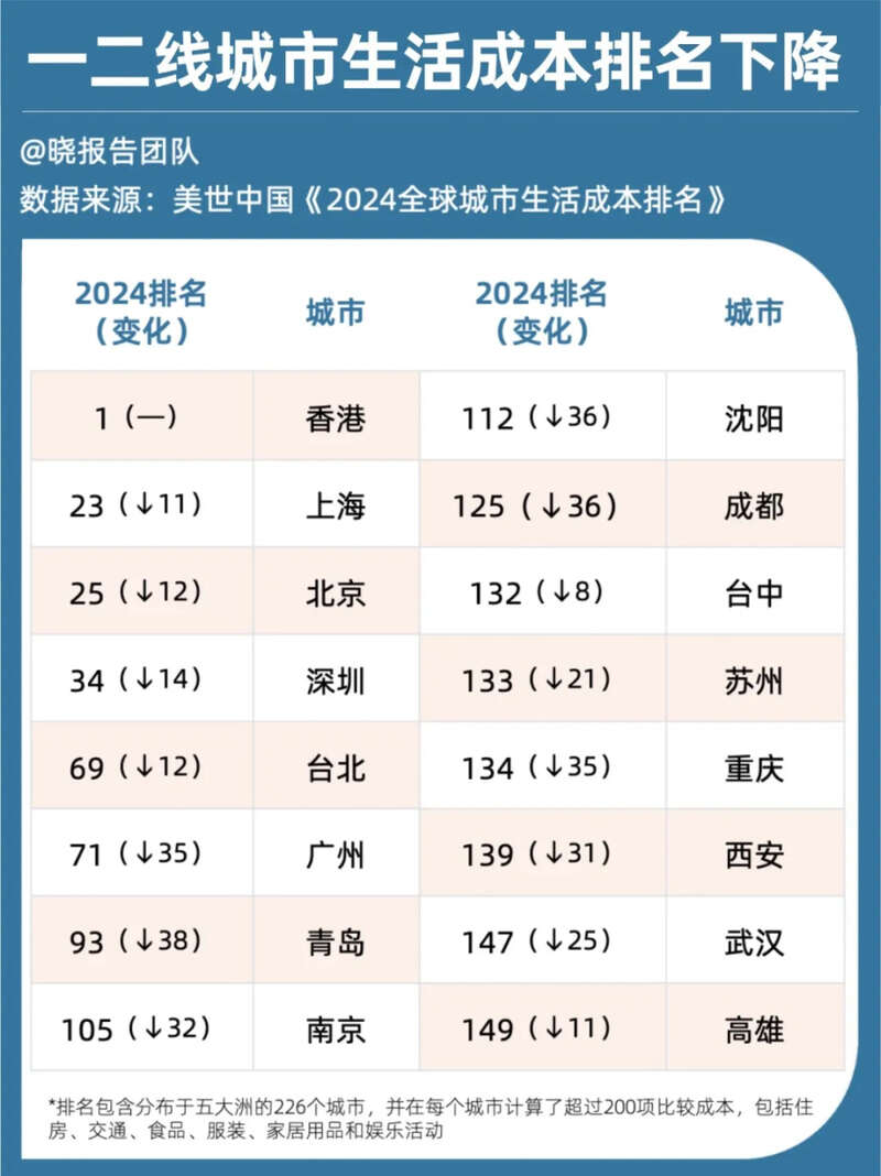 根据美世中国的全球城市生活成本排名,除了北上广深这些“老牌贵地”,新一线城市青岛、南京、成都、苏州、重庆、西安和武汉,以及二线城市沈阳也成功跻身全球TOP150。这意味着,这些城市的国际化程度在提升,但生活压力也在同步增加。