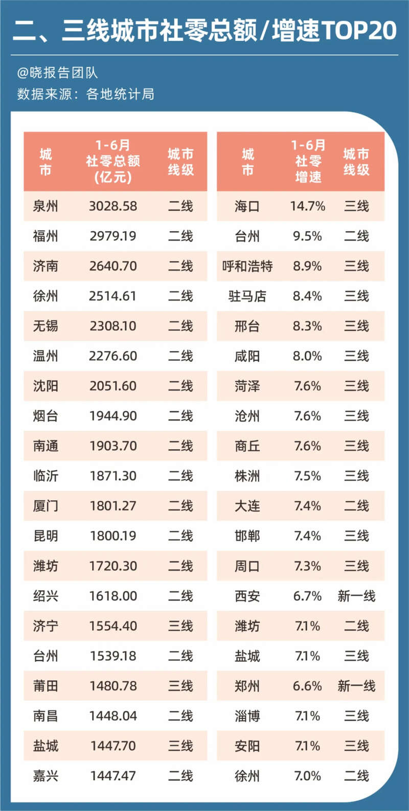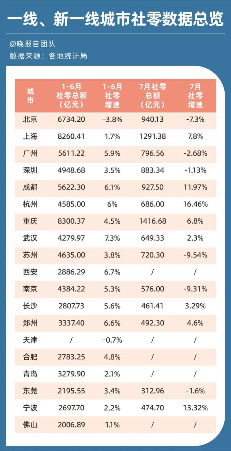 中西部城市则集体上演“努力追赶”戏码。除武汉外,西安6.7%、郑州6.6%、长沙5.6%的社零增速也表现不错。另外,合肥、东莞、佛山虽然总量相对较小,但上半年增速也都还算有活力,分别为4.8%、3.4%和1.1%。