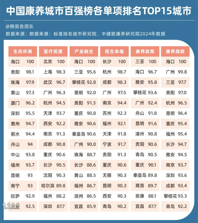 根据《2024年中国康养城市排行榜》,海口、广州、三亚、贵阳、杭州、昆明、重庆、福州、长沙和雅安成为最新的康养城市十强城市。紧随其后的,还有南京、深圳、成都、攀枝花和青岛。其中,海口再次蝉联第一,而青岛继续成为北方城市中的“独苗”。