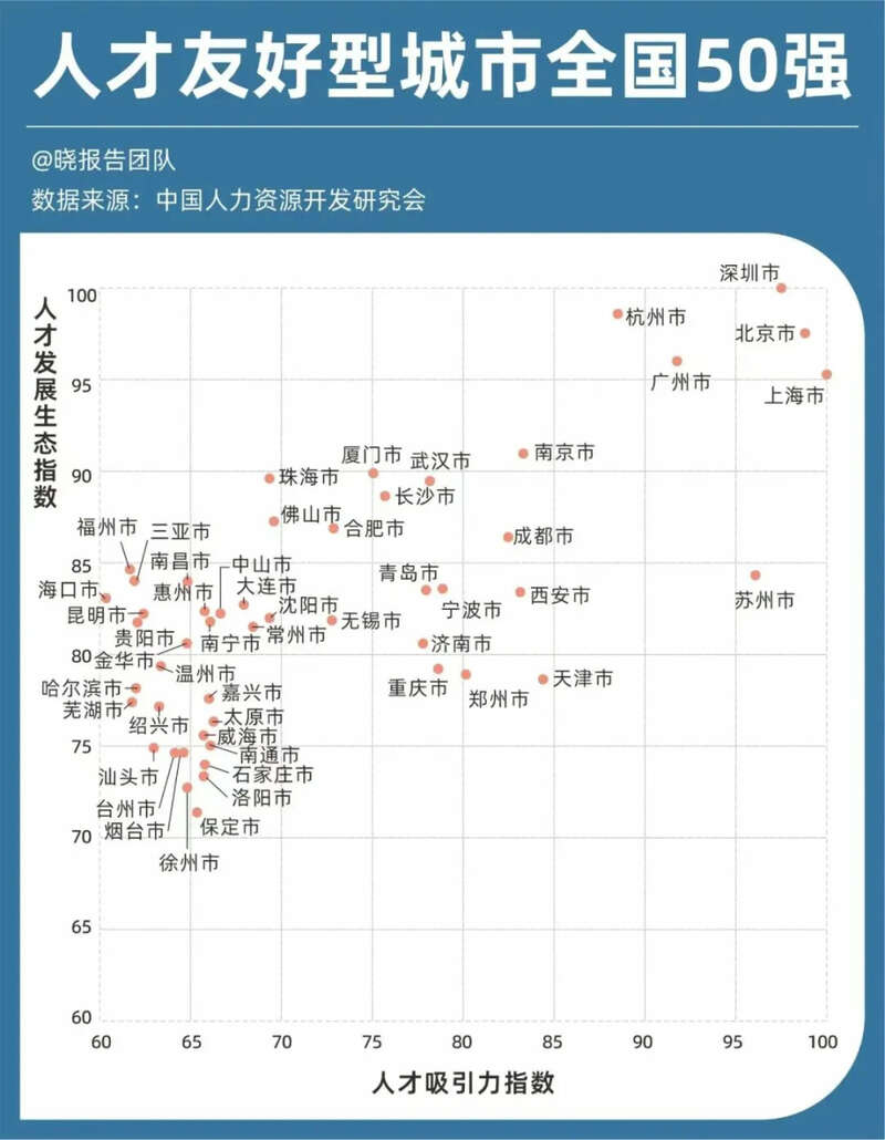 而人才吸引和人口流入,是评价一座适合“搞钱”城市的重要指标,中国人力资源开发研究会还给出了具体的榜单参考。人才友好型城市全国50强城市的评选,一是看城市人才吸引力,包括了向心力、输送力、净流入、聚集度、保持度等六大指标;二是看城市人才发展生态,主要是公共服务、生活品质、职业发展和产业创新这四大“友好度”。