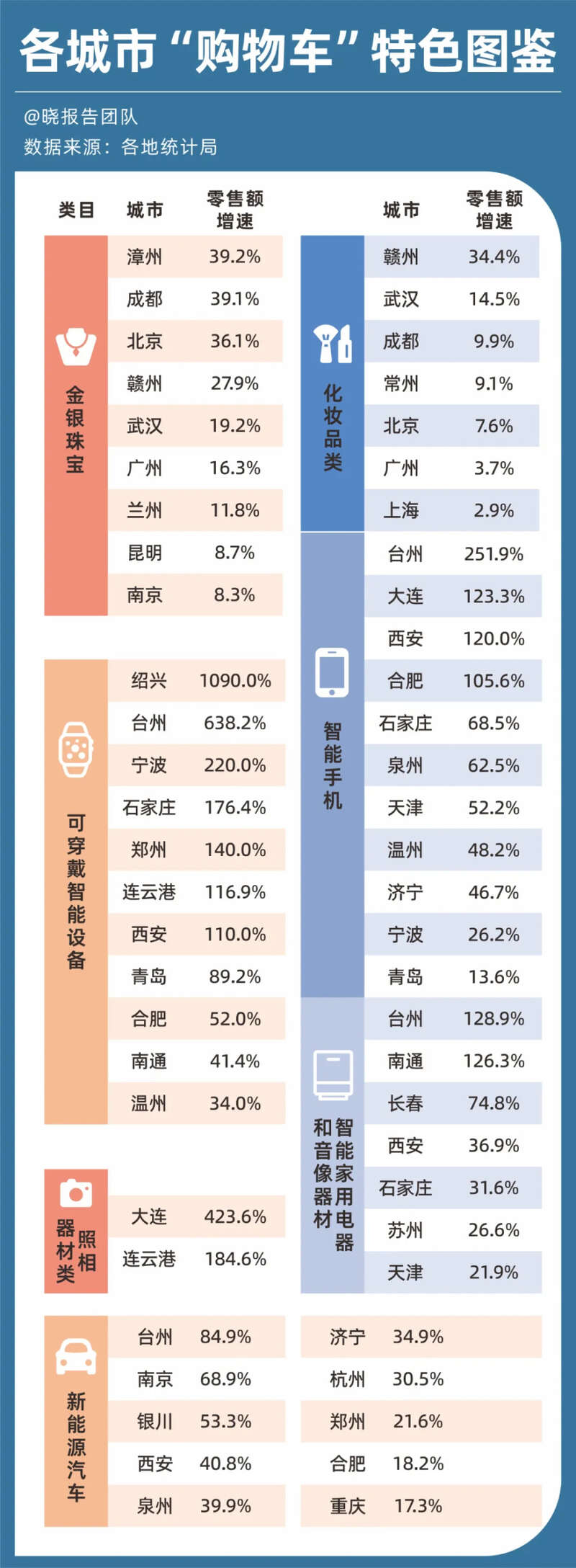 不过,总量的排名之下,真正有意思的是细看每个城市的“购物车”里都装了啥——有的城市高歌于升级类消费,有的则把强音落在实物型商品。