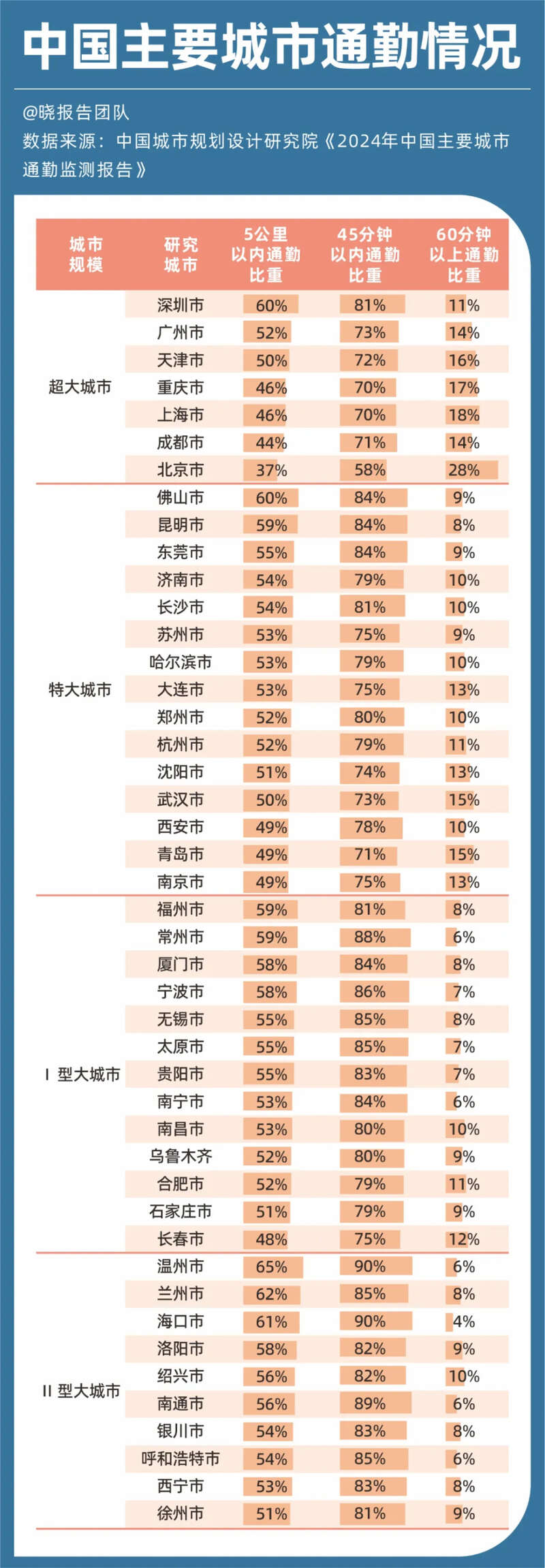 通勤可以说是另一个“幸福感杀手”。根据中规院与百度地图联合发布的《2024年度中国主要城市通勤监测报告》,42个城市5公里以内的幸福通勤由降转升,其中深圳、广州、长沙、武汉等11个城市已经回归2019年以来的最高水平。