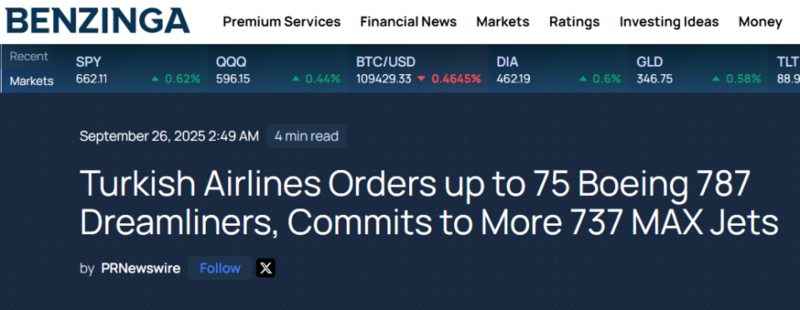 另外,土耳其航空公司向波音下达了最大的宽体飞机787 架梦想飞机订单,交易量为多达 75架,其中包括 35 架 787-9、15 架 787-10,以及另外 25 架的选择权。该航空公司还宣布计划额外购买多达 150 架 737 MAX 飞机,这将标志着其最大的单通道订单。