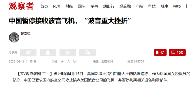 但作为对美国关税反制的一部分,官方已要求国内航空公司停止接收波音公司的飞机,其中一架已被贴上“无需移交即可召回美国”的标签,飞往关岛,退回美国。彭博社称,这是波音在其全球最大市场之一遭遇的又一大挫折。