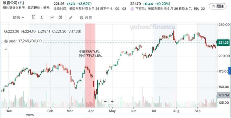 但就在一些人预期波音失去中国市场后,其股价将继续下滑期间,波音居然脱离股价底部,持续上涨。到这个周五的9月26日,波音股价收于221.26美元,比4月7日的低点累计上涨了58.7%,与去年底的收盘股价对比,也上涨了25%。