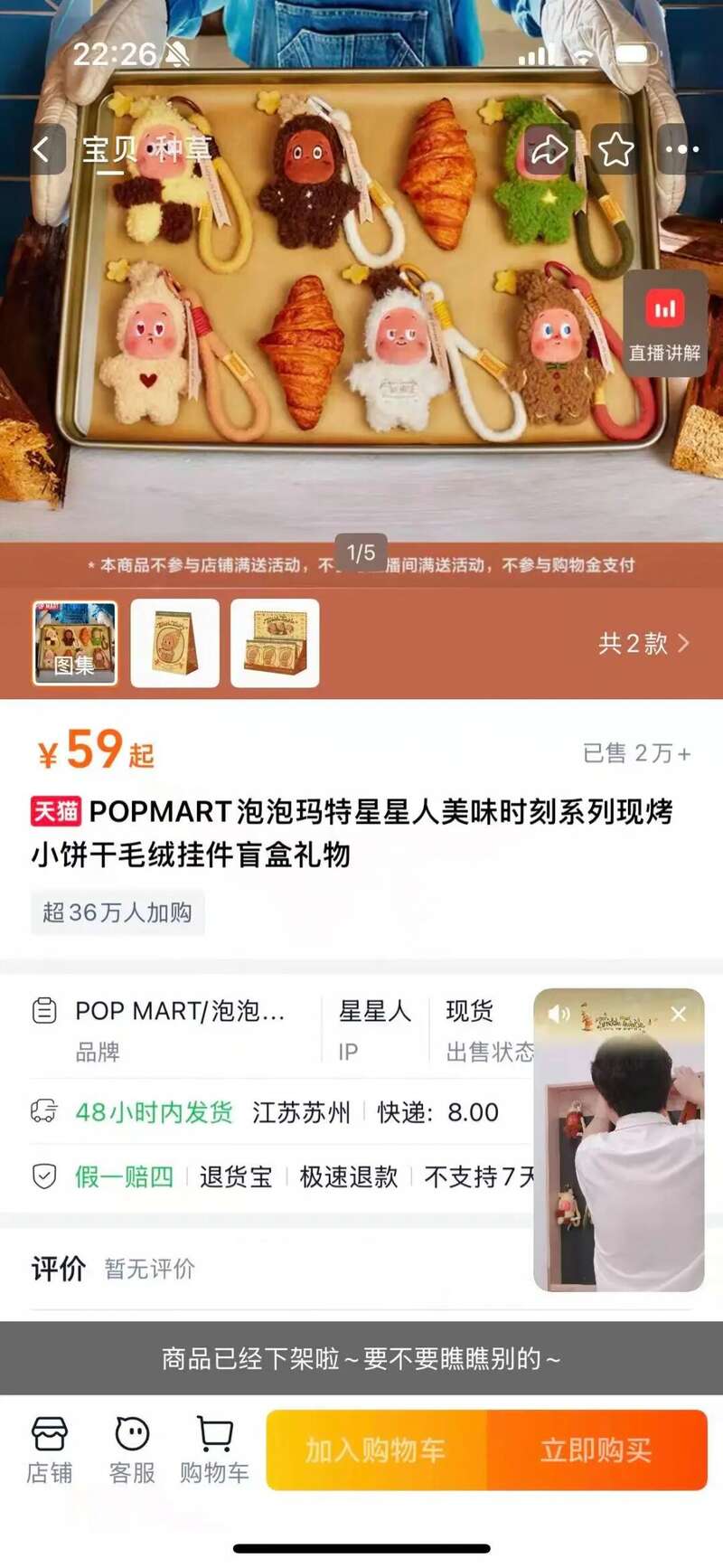 正式开售后,两款星星人系列产品均为秒空。开售十分钟后,天猫页面信息显示,小饼干毛绒挂件有超36万人加购,但首批天猫官方旗舰店放货仅2万+件,手办盲盒玩具摆件显示已售3万+。