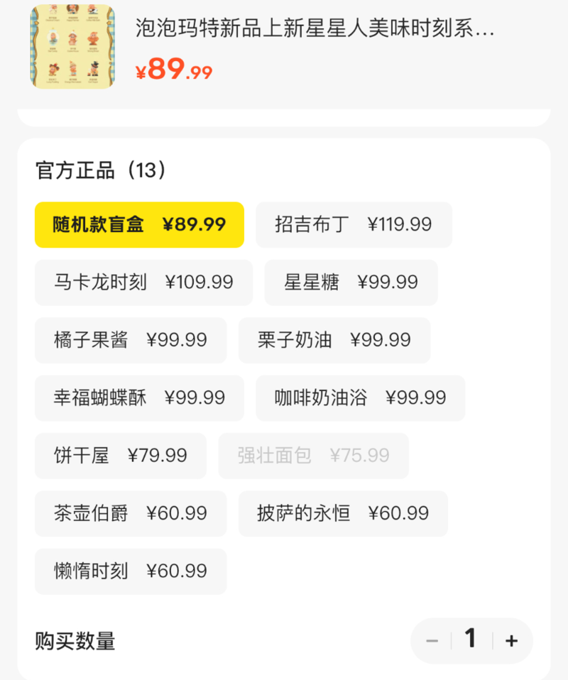 相比发售价格,二手平台上原价69元的手办产品最高涨至119元,系列产品内原价59元的毛绒挂件则更受欢迎,隐藏款“小熊饼干”最高成交价从59元上涨至689元,溢价率近10倍,是近期溢价最高的产品;单个随机盲盒成交价从59元上涨至182元,整盒成交价从354元上涨至769元,溢价率均超2倍,溢价幅度与此前爆火的迷你版Labubu(心底密码系列)不相上下。