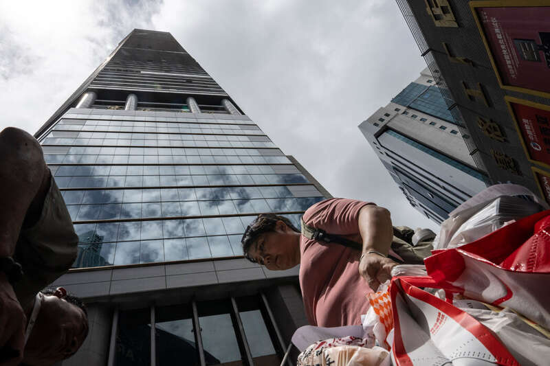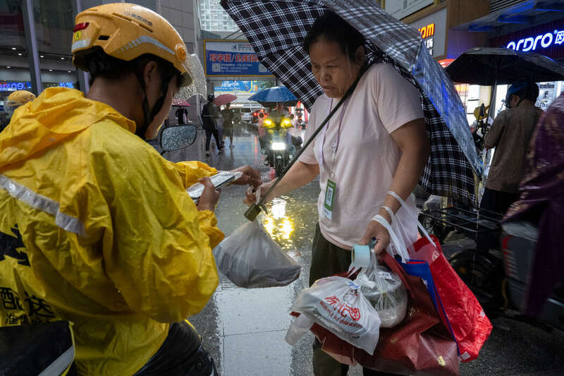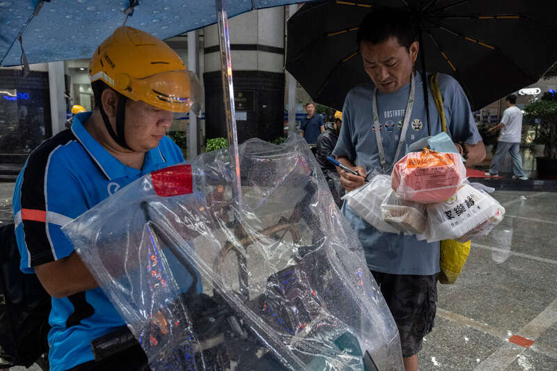 在赛格广场外,一名骑电动车的外卖骑手将餐食交给一位代送跑腿员,由他送到大楼里下单的顾客手中。 赛格广场是中国深圳最高的摩天大楼之一,有大约70层,入驻了数千租户。在午餐高峰期,等电梯的时间可能长达半小时——这对试图完成尽可能多订单的外卖骑手来说简直就是噩梦。解决方案?像16岁的李林星(音)这样的人。