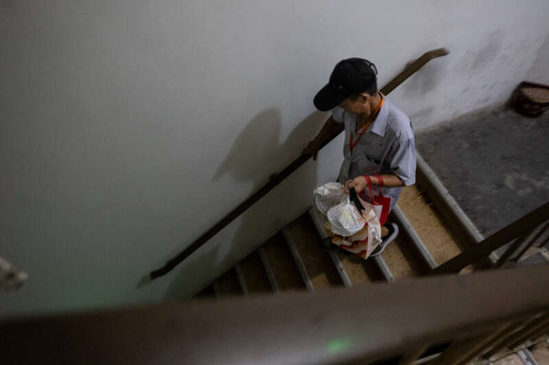一位只透露自己姓周的跑腿员戴着紫色遮阳帽,一到达要去的楼层就立刻按下了下行电梯的呼叫按钮。等她完成配送、跑回电梯厅时,电梯已经等在那里了。她说自己是在食堂工作到法定退休年龄50岁后开始送外卖的。“锻炼身体,”她说。“坐在家里我们闲不住,闲着也很累,闲出病来。”