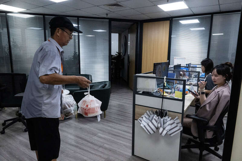 8月的一个周一,当午餐时间临近时,他来到大楼入口附近,目光扫视着周围的街道。当一名外卖员出现时,李林星高举手臂大喊:“代送!”