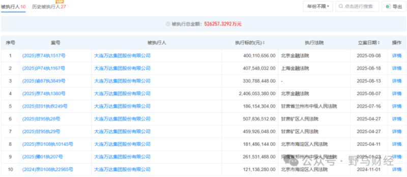 根据天眼查信息,万达集团有10条被执行人信息,被执行总金额达52.63亿元,执行法院包括北京金融法院、上海金融法院、兰州市中级人民法院、郑州市中级人民法院等,单笔执行金额均在1亿元以上,最大一笔超过24亿元。立案时间集中在2025年。