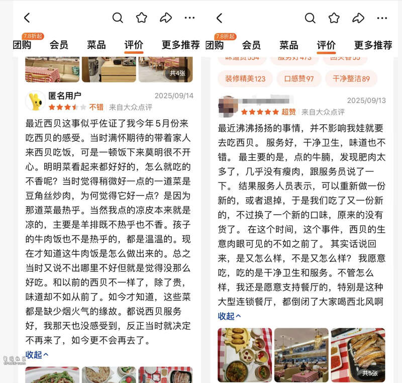 在风波后,这家西贝门店的平台评论区新增了两条评论,也代表了当前用户对于西贝的两种典型观点。一位用户写道,“最近沸沸扬扬的事情,并不影响我娃就要去吃西贝……在这个时间,这个事件,西贝的生意肉眼可见的不如之前了。 其实话说回来,是又怎么样,不是又怎么样? 我愿意吃,吃的是干净卫生和服务。”