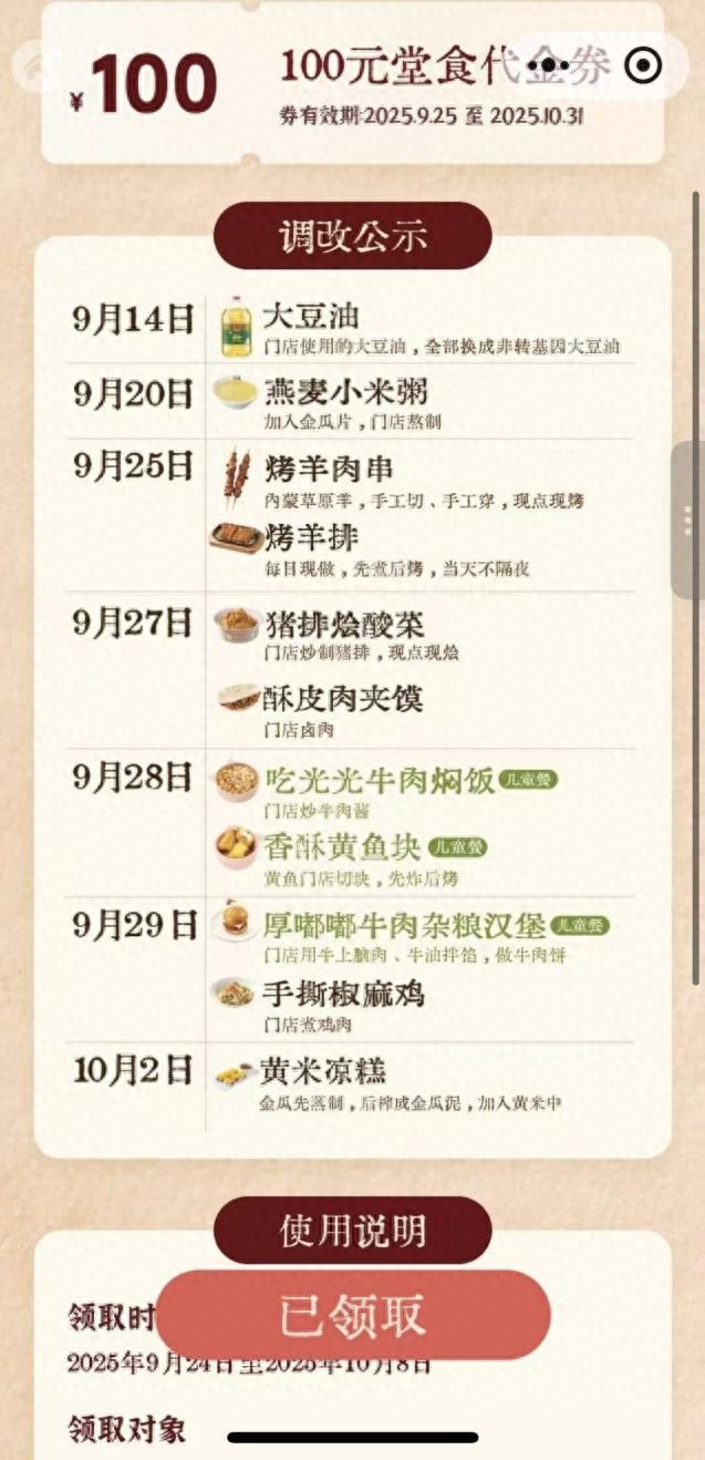 来源/西贝小程序截图 扫码领取100元代金券即可看到该调改公示